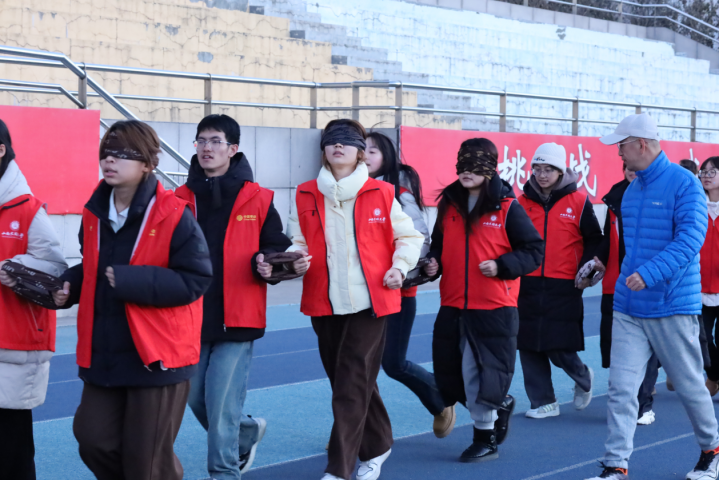 随后,志愿者们移步操场,开启盲跑沉浸式体验。两两分组,当“视障者”蒙上双眼,将肩头的重量托付给同伴,踏入了一段依靠信任前行的旅程;“引导者”则将宣讲中学到的技巧化作行动,带领同伴稳稳穿越预设的每一段路线。从最初的生疏试探,到渐入佳境的默契呼应,志愿者们在体验中触摸到视障群体出行的不易,也在陪伴的过程中,读懂了助盲服务背后的责任与意义。